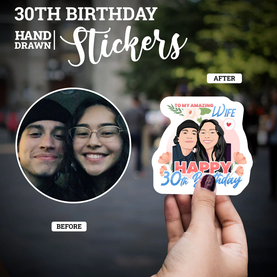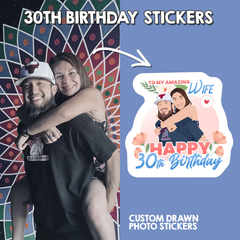 Our artists love creating one-of-a-kind, unique 30th birthday stickers. Each sticker is a hand-drawn custom recreation of your image, and once approved through email or Facebook messenger, your personalized stickers are shipped to you.