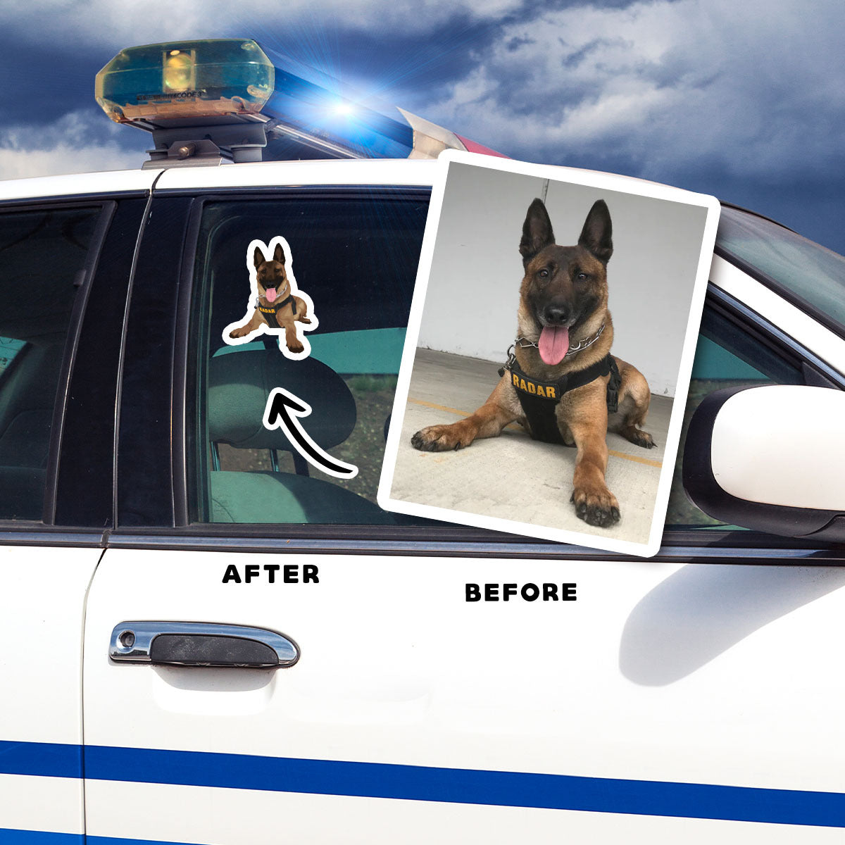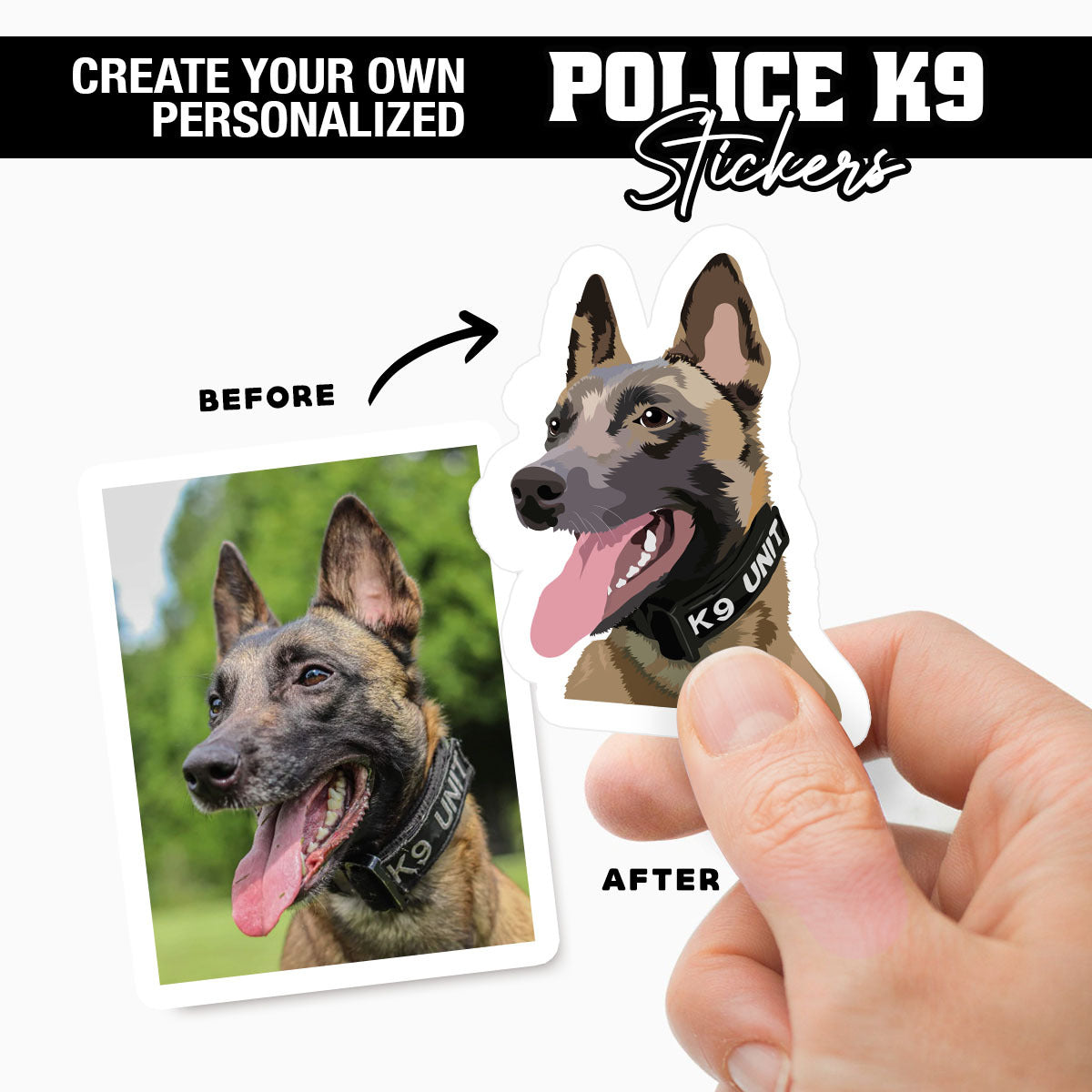 Working in a dangerous field with a dog is daunting and stressful, but the bond developed between a police officer and his K9 is unbreakable. Our custom police K9 stickers celebrate this bond with custom recreations. There’s nothing more special than immortalizing memories through prints.
